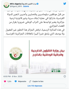 L’Algérie, qui évoque la violation de sa souveraineté nationale, rejette ce développement « inadmissible » qui cause « un grand dommage » aux relations algéro-françaises.