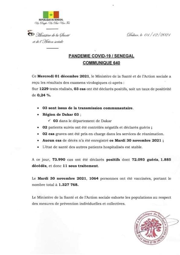- A ce jour, le Sénégal compte 73990 cas déclarés positifs dont 72093 guéris, 1885 décès et 11 sous traitement.