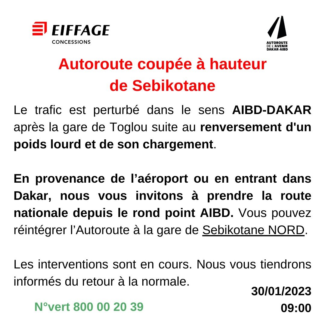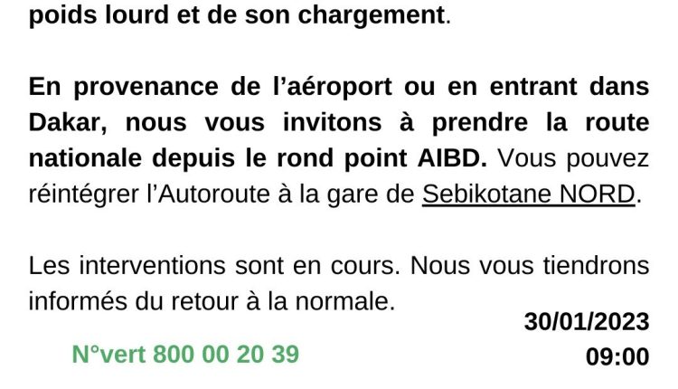 [Document] Autoroute : Un poids lourd se renverse à hauteur de Sebikotane, le trafic perturbé Société Par Le GP On Jan 30, 2024 Partager Autoroute : Un poids lourd se renverse à hauteur de Sébikotane, le trafic perturbé lourdpoisrenverseSEBIKHOTANE Partager