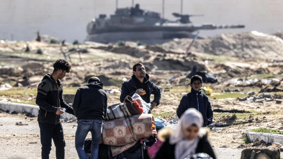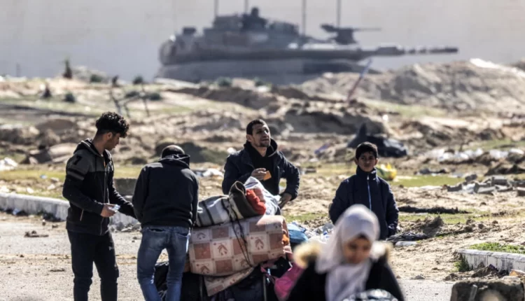 Un char de combat israélien en arrière-plan de cette photo montrant des déplacés palestiniens fuyant Khan Younès, dans le sud de la bande de Gaza, ce mardi 30 janvier 2024. AFP – MAHMUD HAMS