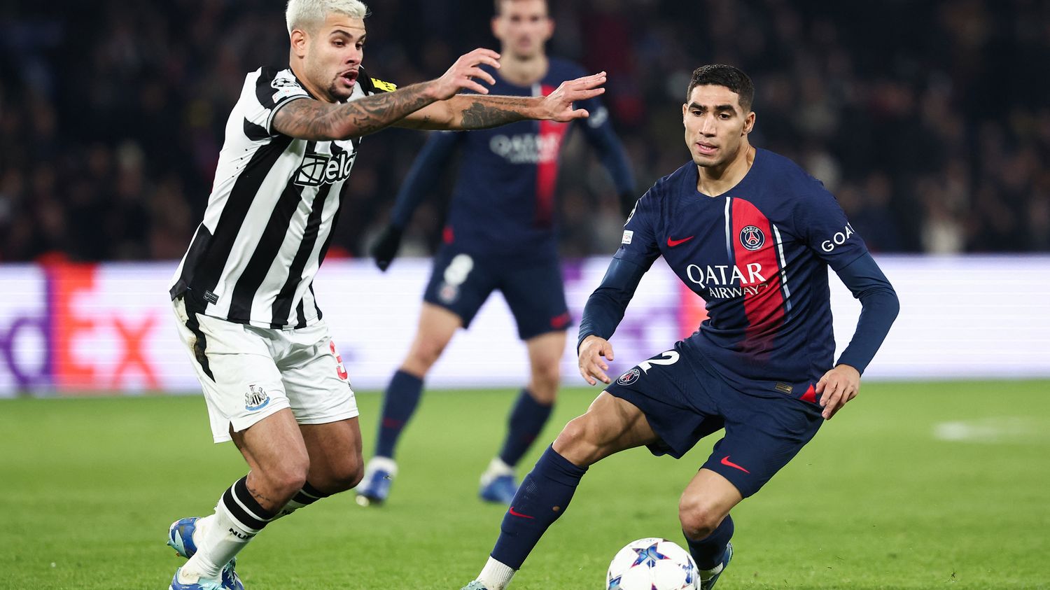 Ne pas se louper au Parc des Princes pour s’éviter une dernière journée décisive, telle était la mission des hommes de Luis Enrique ce mardi soir, avec la réception de Newcastle. Et aussi prendre la revanche sur le match aller, qui avait exposé des faiblesses criantes (défaite 4-1 en Angleterre). Pour cela, le coach espagnol faisait tourner son effectif par rapport au match contre Monaco, avec les titularisations de Danilo, Lee et Kolo-Muani. Newcastle, de son côté, était pénalisé par de nombreuses absences. Et cela se voyait, notamment du côté habituel de Dan Burn, dominant à l’aller et remplacé par Livramento ce mardi soir. Dembélé et Hakimi s’engouffraient avec envie dans le couloir droit et offraient très vite des situations de but (4e, 9e). Et les faiblesses du PSG ? L’une d’entre elles est la qualité de relance de Donnarumma, qui était proche d’aboutir à un but d’Isak (12e).