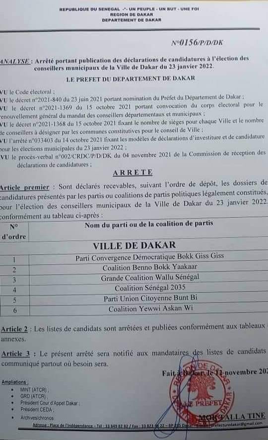 Le préfet de Dakar a validé six (6) listes pour la ville de Dakar, en direction des locales du 23 janvier 2022.Il s’agit de la coalition Yewwi Askan Wi, Wallu Sénégal, Benno Tass Yakar, coalition horizon 2035 bou Mbaye Prodac ak Thiompal, Bokk Gis Gis et Parti Union Citoyenne Bunt bi.