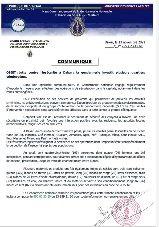 La Gendarmerie nationale a engagé régulièrement d’importants moyens pour effectuer des opérations de sécurisation dans la capitale, notamment dans les zones criminogènes. Et au cours du dernier trimestre, plusieurs localités dont Hann Bel Air, Maristes, Cité Mermoz, Oukam, Almasies, Ngor, Yoff, Rufisque, Mbao, Keur Mbaye Fall, Keur Massar et Tivaouane Peulh ont été visitées.