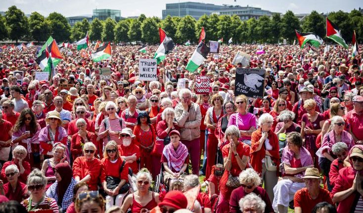 Quelque 150 000 personnes étaient présentes à la manifestation ce dimanche 15 juin à La Haye, selon les organisateurs. Des groupes de défense des droits, tels qu’Amnesty International et Oxfam, ont appelé à cette marche à travers la ville jusqu’à la Cour internationale de justice, créant ce qu’ils ont appelé une « ligne rouge ».